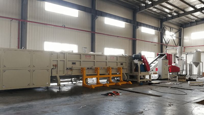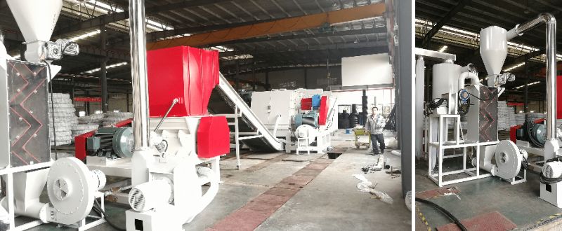 我司給出的方案是:先用臥式雙軸撕碎機進(jìn)行撕碎,然后由輸送帶喂入破碎機,破碎以后由吸料風(fēng)機進(jìn)到粉末分離裝置,最后由風(fēng)機送到料倉收集。