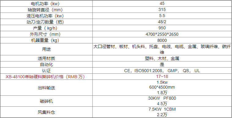 | XB-48100單軸硬料撕碎機價(jià)格(RMB:萬(wàn)) | 歡迎來(lái)電咨詢(xún) |
