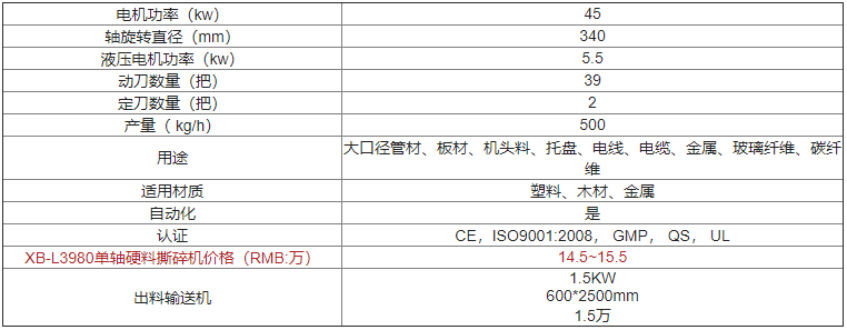 | XB-L3980單軸軟料撕碎機價(jià)格(RMB:萬(wàn)) | 歡迎來(lái)電咨詢(xún) |