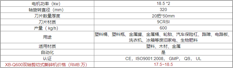| XB-Q600雙軸剪切式撕碎機價(jià)格(RMB:萬(wàn)) | 歡迎來(lái)電咨詢(xún) |
