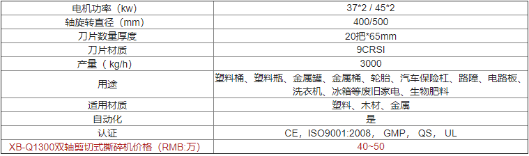 | XB-Q1300雙軸剪切式撕碎機價(jià)格(RMB:萬(wàn)) | 歡迎來(lái)電咨詢(xún) |