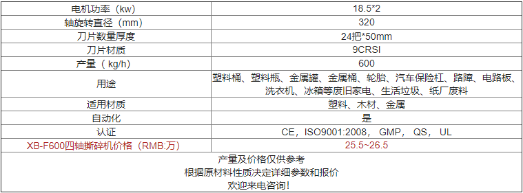 | XB-F600四軸撕碎機價(jià)格(RMB:萬(wàn)) | 歡迎來(lái)電咨詢(xún) |
