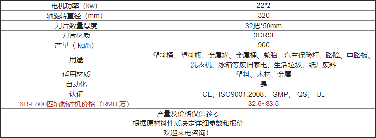 | XB-F800四軸撕碎機價(jià)格(RMB:萬(wàn)) | 歡迎來(lái)電咨詢(xún) |