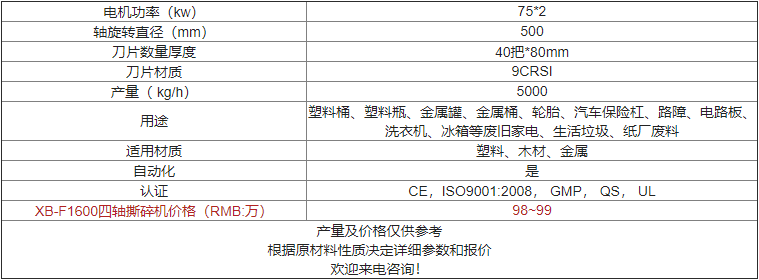 | XB-F1600四軸撕碎機價(jià)格(RMB:萬(wàn)) | 歡迎來(lái)電咨詢(xún) |